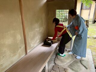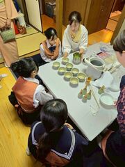 茶道の魅力を伝えることを目的に、茨城県内の中学・高校・大学の茶道部の生徒さんを対象として、学校茶道連絡協議会の先生方と合同で開催しました。私たち青年部は、作り物体験(古帛紗づくり)と薄茶席を担当しました。お客様としてお菓子・抹茶のいただき方を体験いただき、水屋ではお菓子を菓子器に並べたり、抹茶を点てたり、茶碗を清める体験をしていただきました。学茶先生方の濃茶席では、寄付・蹲・席入りの仕方や、濃茶をいただく体験をしていただき、学生からは「はじめての濃茶は思っていたより飲みやすく美味しかった」「茶筅振りのコツを教えてもらい、部活でも練習したい」などの感想がありました。