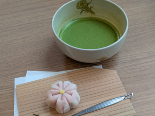 今回は、桜の形をした練り菓子を作成しました。先生である行松さまの分かりやすいご指導のもと、参加者一同試行錯誤し作りました。桜の淡いグラデーションのピンクを出すのが非常に難しかったです。出来立てのお菓子とお抹茶は格別でした!